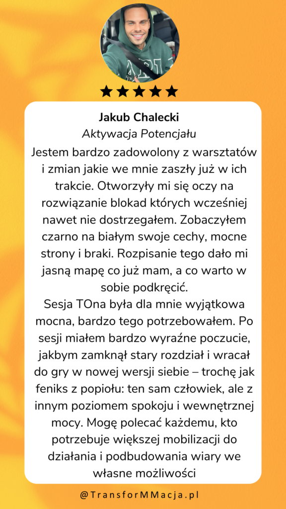 SPRAWDŹ JAK WARSZTAT WYGLĄDA AKTYWACJA POTENCJAŁU „OD KUCHNI„: (Poniższy materiał to unikalne archiwum z naszej pierwszej, pilotażowej edycji (na nagraniu widać współprowadzącą Sandrę, której głos w obecnej edycji będziesz mógł usłyszeć w części procesowej TONa):
